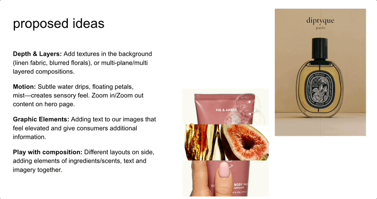 the direction leaned into a clean but expressive visual system combining product photography with textures, ingredient storytelling, and subtle motion.
